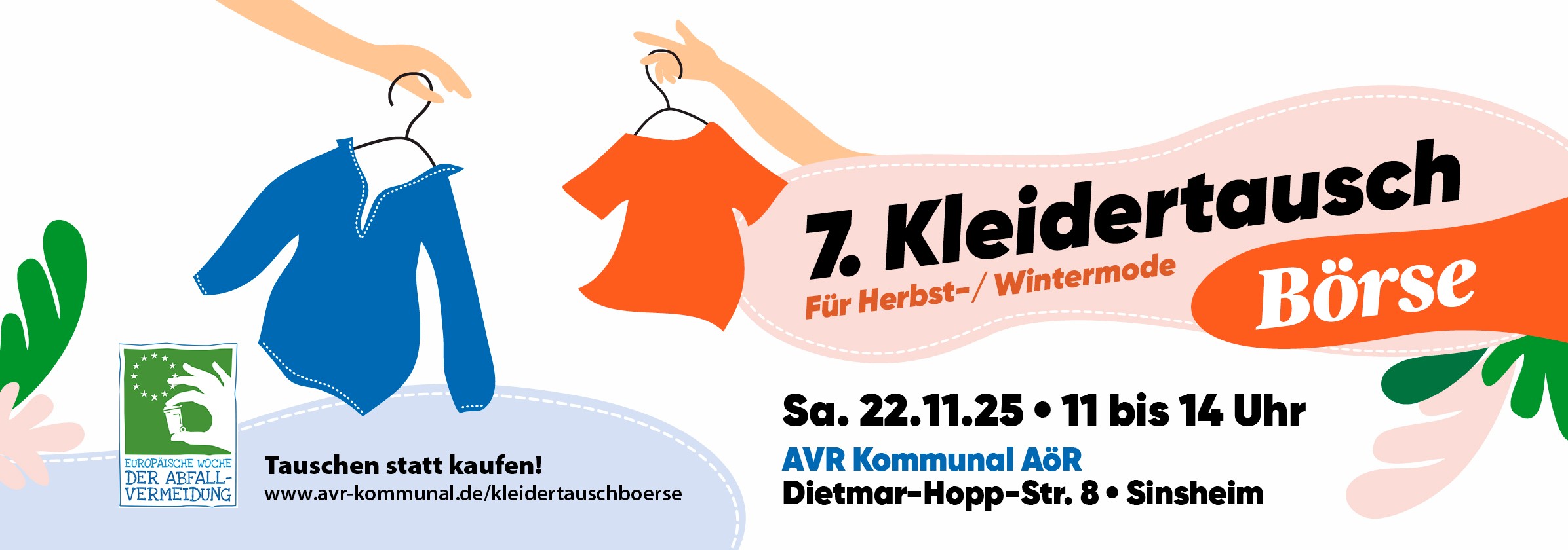 Die "7. Kleidertauschbörse der AVR Kommunal" findet am Samstag, den 22. November 2025, von 11:00 bis 14:00 Uhr statt.